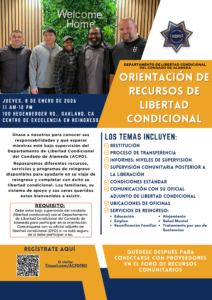 Únase a nosotros en la Orientación de recursos de libertad condicional para conocer sus responsabilidades y qué esperar mientras esté bajo supervisión con el Departamento de libertad condicional del condado de Alameda (ACPD). Esto tendrá lugar durante la primera hora del Foro de Recursos Comunitarios (CRF) el jueves, 8 de enero de 2026 de 11 am-12 pm en 100 Hegenberger Rd, Oakland, CA. Lo invitamos a permanecer en el CRF para conectarse con proveedores de reingreso. Consulte el folleto para obtener más detalles.