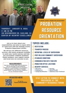 Join us at the Probation Resource Orientation to learn about your responsibilities and what to expect while on supervision with the Alameda County Probation Department (ACPD). This will take place during the first hour of the Community Resource Forum (CRF) on Thursday, January 8th from 11 am-12 pm at 100 Hegenberger Rd, Oakland, CA. We invite you to stay at the CRF to connect with reentry providers. See flyer for details.