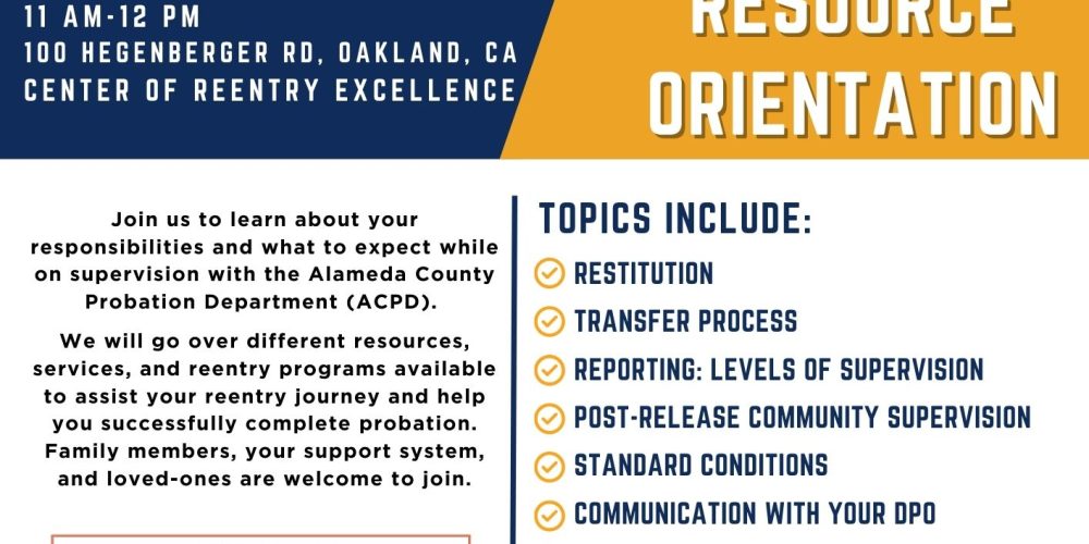 Join us at the Probation Resource Orientation to learn about your responsibilities and what to expect while on supervision with the Alameda County Probation Department (ACPD). This will take place during the first hour of the Community Resource Forum (CRF) on Thursday, January 8th from 11 am-12 pm at 100 Hegenberger Rd, Oakland, CA. We invite you to stay at the CRF to connect with reentry providers. See flyer for details.