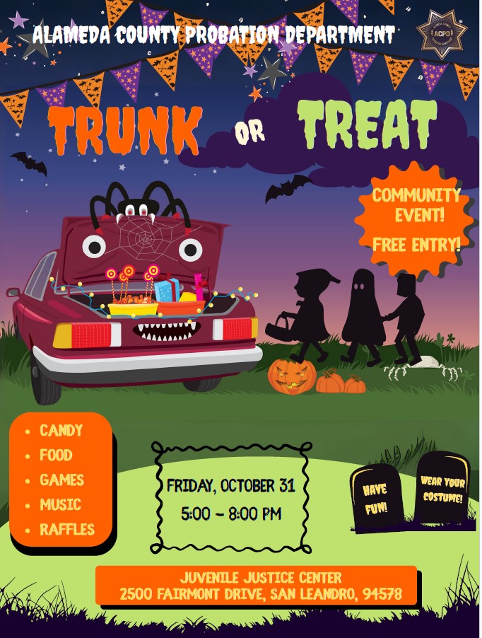 Join us at the Alameda County Probation Department’s Trunk or Treat event on Friday, 10/31 from 5 pm-8 pm at 2500 Fairmount Dr., San Leandro, CA (Juvenile Justice Center).