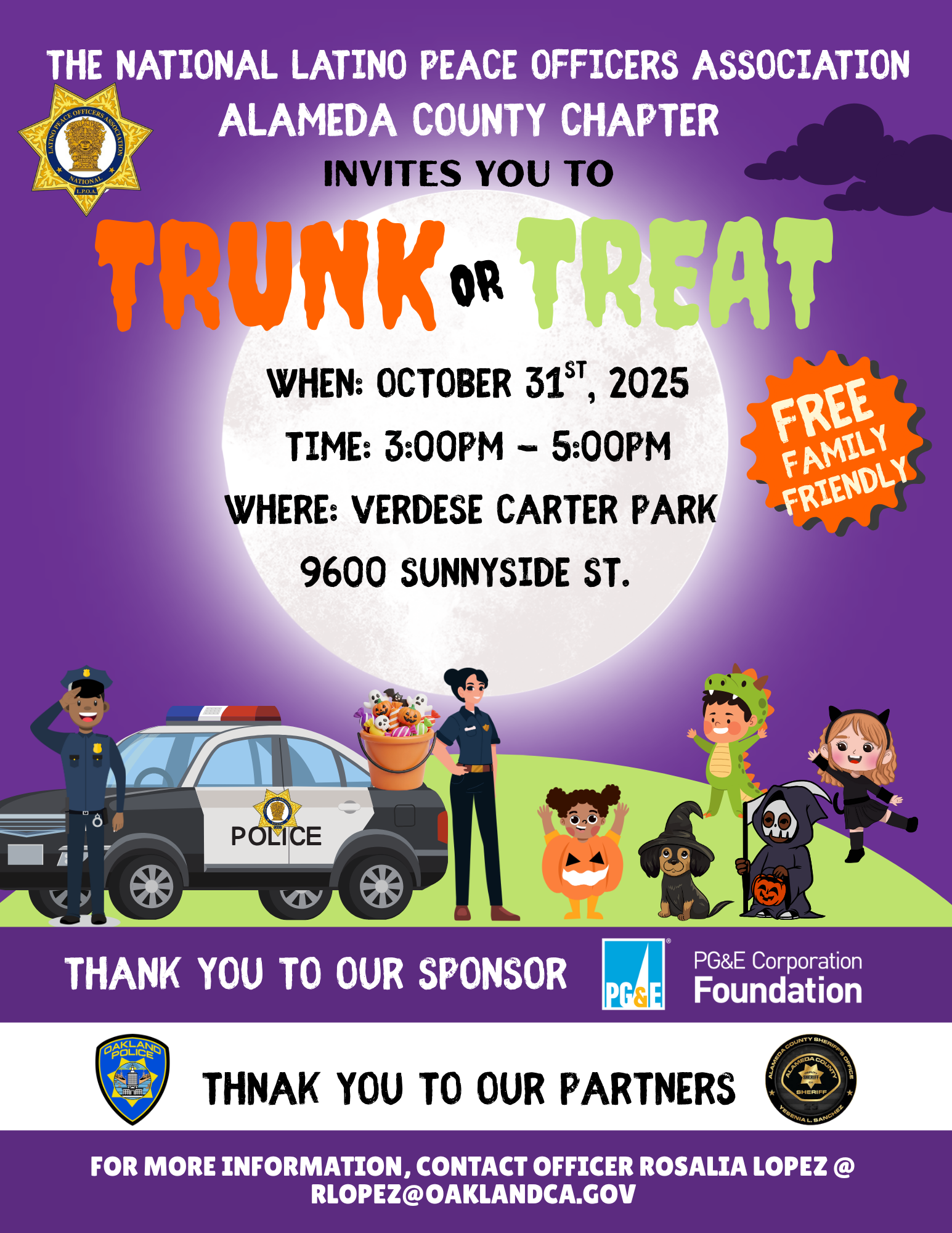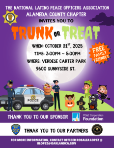 Join us for a free family-friendly Trunk or Treat event hosted by the National Latino Peace Officers Association Alameda County Chapter on Friday, 10/31 from 3 pm-5 pm at 9600 Sunnyside St., Oakland, CA (Verdese Park).