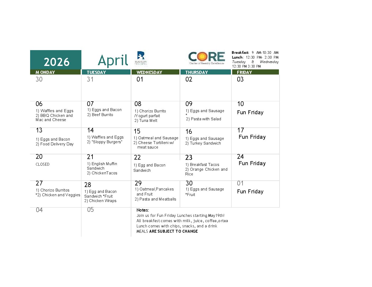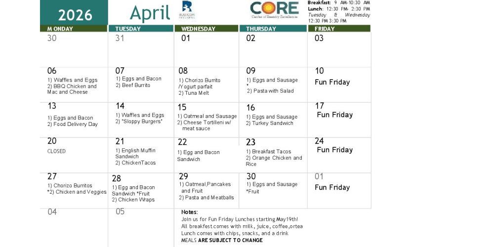 See below for CORE April 2026 Meal calendar.