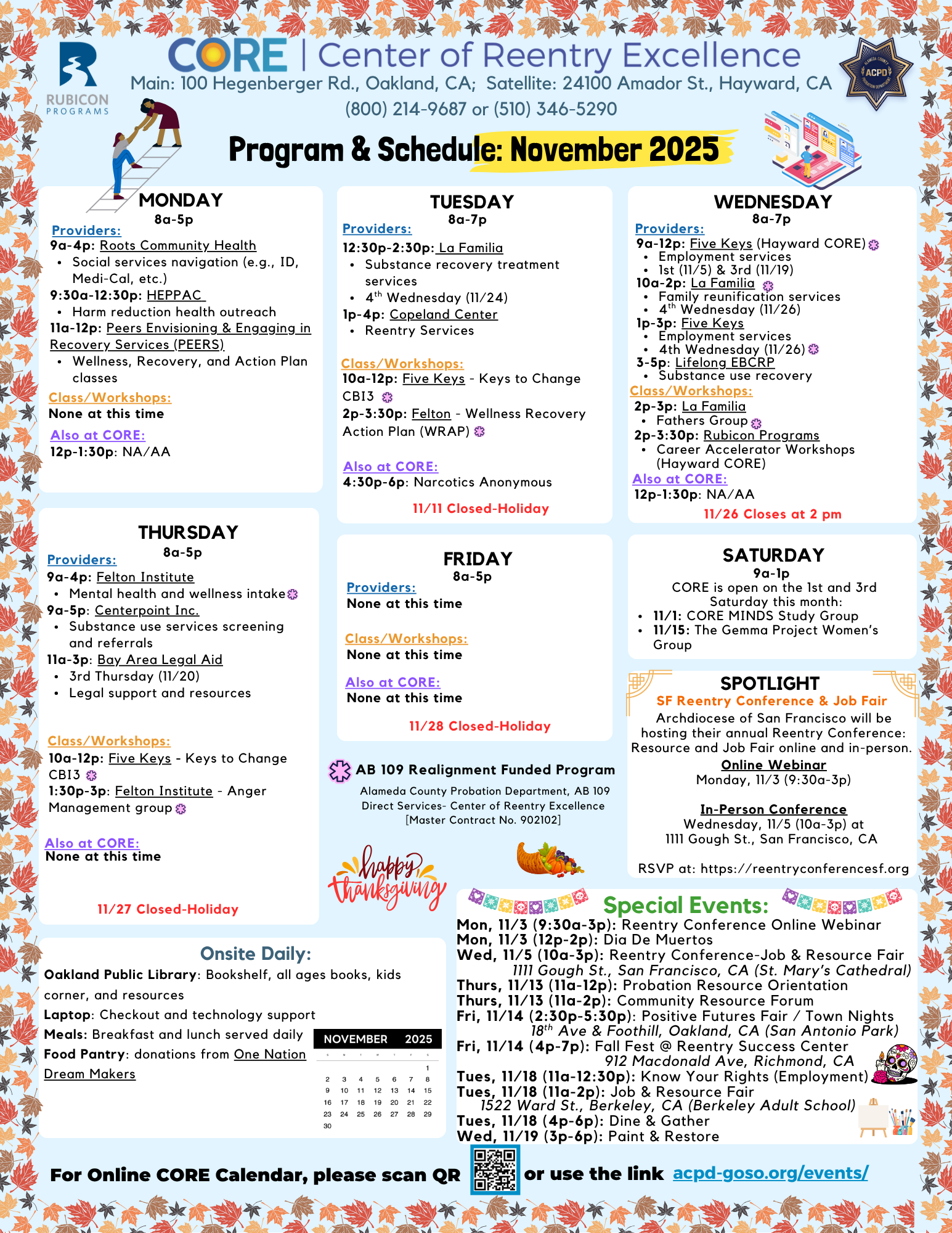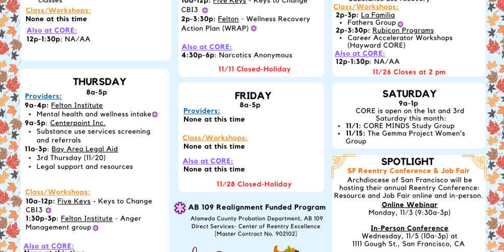 - Wed, 11/5 (10a-3p): Reentry Conference-Job & Resource Fair