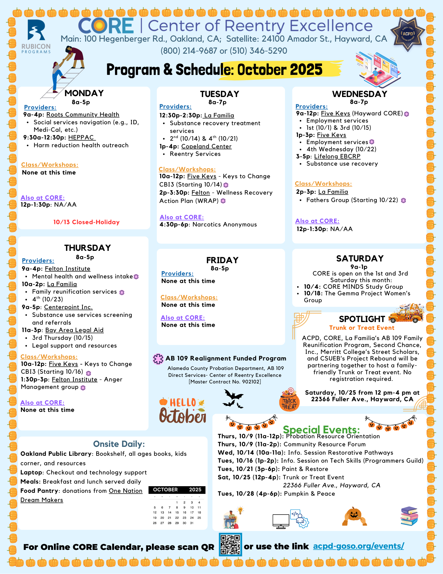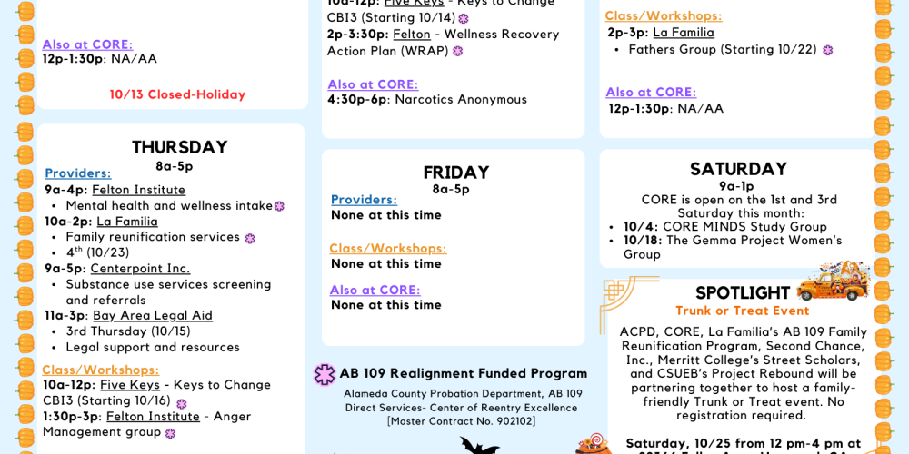 - Thurs, 10/9 (11a-12p): Probation Resource Orientation