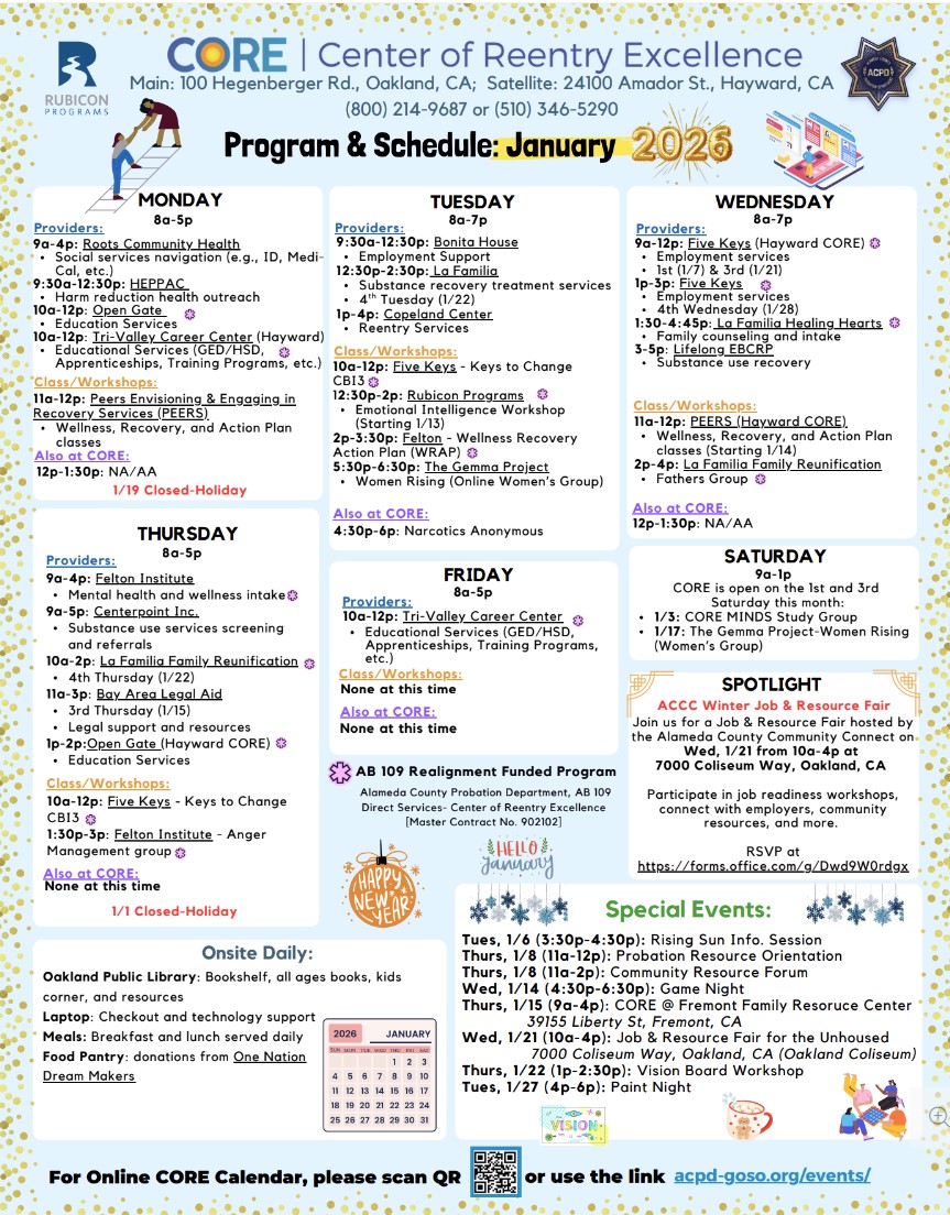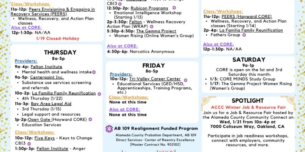 • Thurs, 1/15 (9a-4p): CORE @ Fremont Family Resource Center