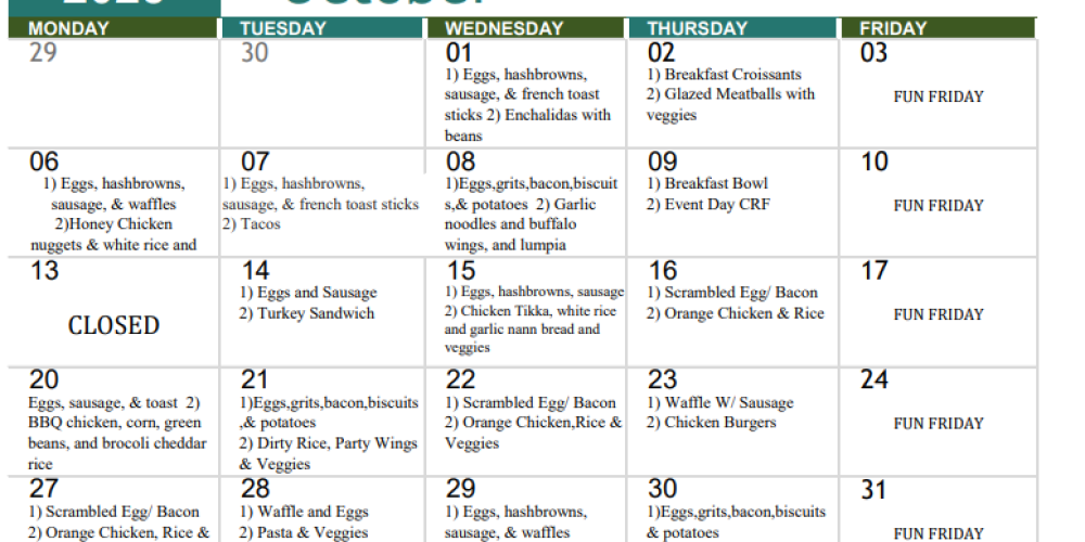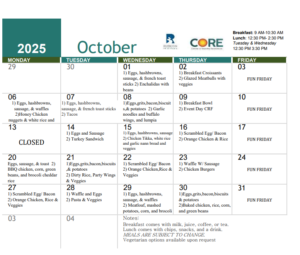 See below for CORE October 2025 Meal calendar.
