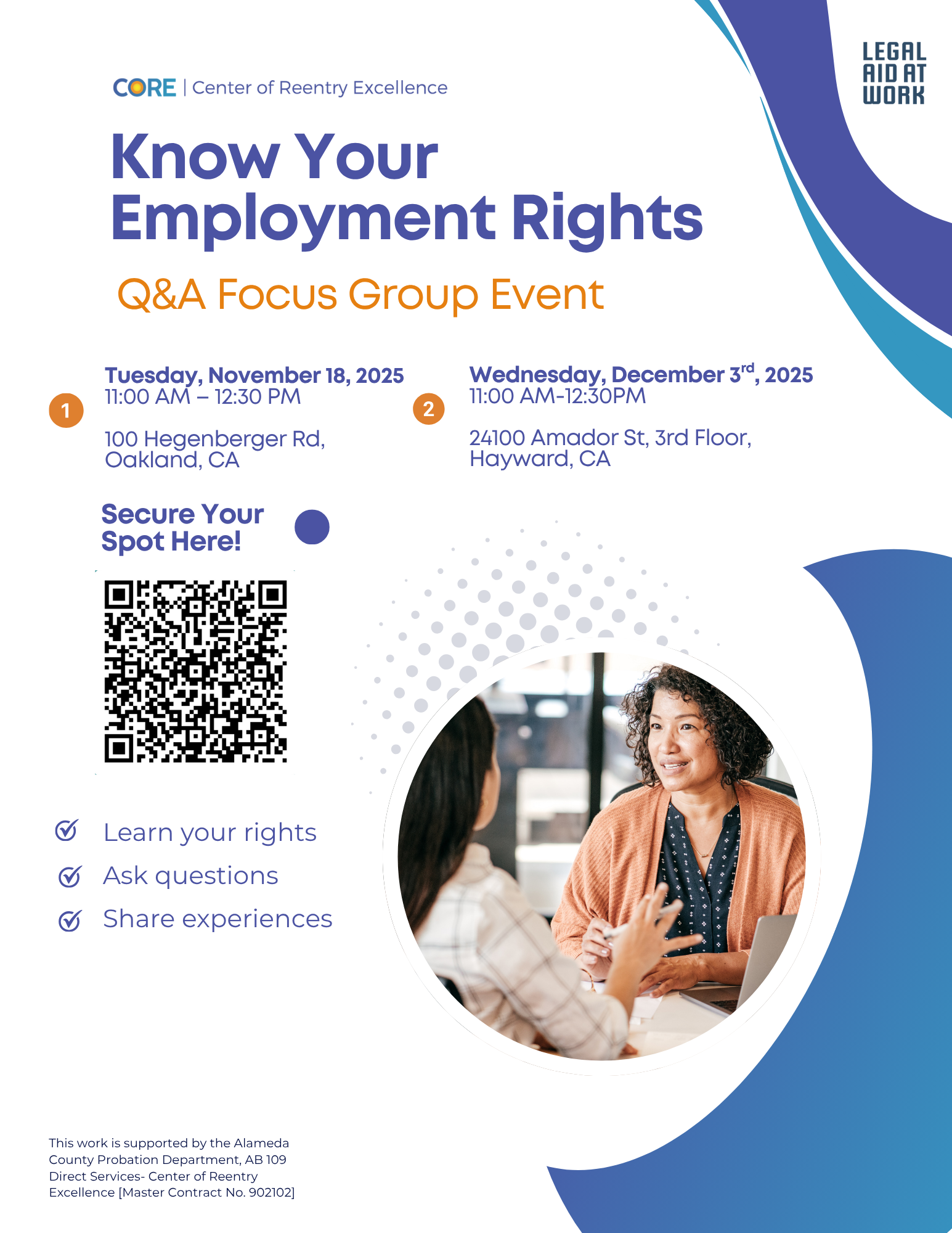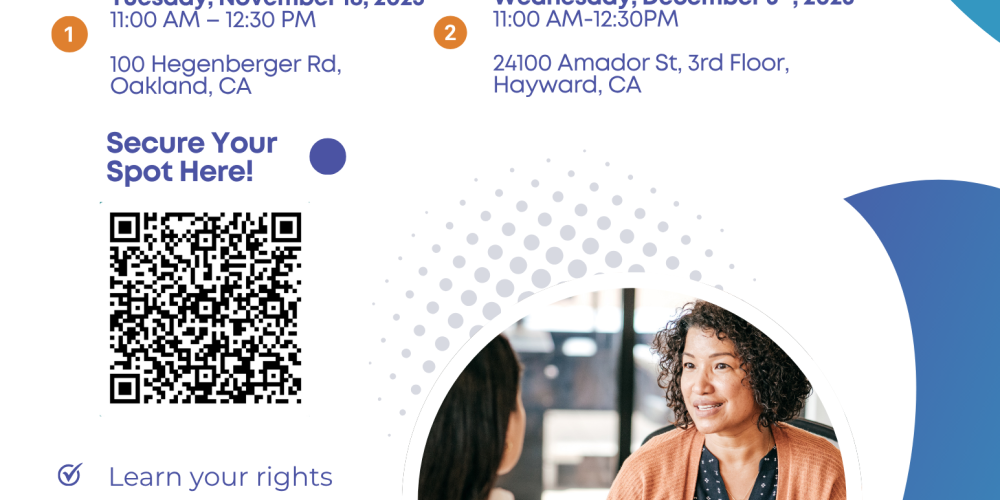 Join us for a Know Your Rights Workshop on employment hosted by the Bay Area Legal Aid on Tues., 11/18 from 11 am-12:30 pm at 100 Hegenberger Rd., Oakland, CA. See flyer for details.